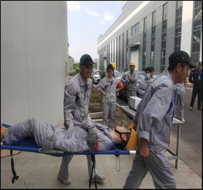演練開始,倉(cang) 儲(chu) 部員工趙德超在庫區內(nei) 使用5T起重機吊裝銅牌正在作業(ye) ,員工魏亞(ya) 方駕駛叉車進行物資運輸作業(ye) ,因吊運銅牌距離地麵約1.5米,在魏亞(ya) 方駕駛叉車經過時,銅牌旋轉導致插入叉車駕駛艙,將魏亞(ya) 方手臂擊中劃傷(shang) 導致大出血癱坐在駕駛椅上。趙德超發現魏亞(ya) 方受傷(shang) 後立即鳴哨代表事故發生,跑步到副總指揮孟雪峰麵前簡單報告特種設備傷(shang) 害事故地點、機械、人員具體(ti) 情況。隨即孟雪峰向總指揮劉冬冬報告,劉冬冬指示“盡快搶救傷(shang) 員,立即啟動特種設備傷(shang) 害突發事故應急預案”。副總指揮孟雪峰立即與(yu) 當地醫院進行協調請求醫療支援,並安排後勤保障組組長周仕磊保證演練救護便道的暢通及救護車輛的引導;安全警戒組組長王習(xi) 風率領安全警戒組成員王波波迅速拉起警戒線,引導周圍職工撤離到安全區並疏散圍觀人員,為(wei) 現場救護提供了足夠的場地。應急救援組組長陳鵬輝率領應急救援組成員莊富強、趙森、陳讚跑到事故叉車旁將受傷(shang) 員工魏亞(ya) 方從(cong) 駕駛艙內(nei) 轉移到地麵準備接受現場應急醫療救援;醫療救護組組長高傑率領醫療救護組成員李秀榮、淩蕾攜帶急救箱和擔架到達事故地點,對受傷(shang) 人員魏亞(ya) 方進行進行消毒、止血、包紮等簡單處理,並初步查看其受傷(shang) 程度,以便進行下一步的救護工組;醫院急救車120在後勤保障組組長周仕磊的引導下來到事故演練現場;醫療救護組組長高傑立即安排2位員工(徐鬆、薛龍峰)將傷(shang) 員用擔架抬至醫院救護車上,醫療救護組李秀榮、淩蕾隨車出發護理傷(shang) 員;安全警戒組組長王習(xi) 風率領安全警戒組成員王波波收起警戒帶並對現場進行善後處理。