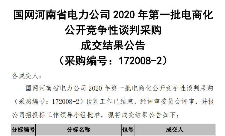 恭喜我司中標國網河南省電力公司2020年第一批電商化公開競爭性談判采購